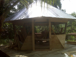 It is the end of July 2009 and this is our loveshack that we’ll be living in while we build our house. It has all the walls now and has screen around the entire building. It is made using the starplate system. Barry & his Dad Peter built it last year. When we arrive in December, Barry is going to add running water, a place to poo and a shower. Or we will shower when it rains, dig a hole and drink from the spring.