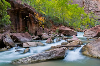 There is no single iconic image from Zion; it has slot canyons, peaks and river valleys, all very colorful. My favorite images were taken while walking along the river capturing emerald cascading water against red rocks. For this an 8-10 stop neutral density filter is a must to help you get that soft misty water. A neutral density filter is essentially a dark piece of glass and when you put it in front of your lens it makes you exposure longer because your camera has less light going through it. The longer your exposure the “softer” or more misty your water is going to look. My minimum exposure with cascading water is ¼ of a sec but I try to get it anywhere from 2 seconds to 2 minutes.